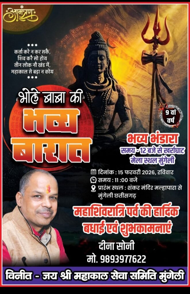 महाशिवरात्रि के अवसर पर प्रतिवर्ष की भांति इस वर्ष भी भव्य शिव बारात निकाली जाएगी। जय महाकाल सेवा समिति के आयोजक दीना सोनी ने जानकारी देते हुए बताया कि लगातार नौवें वर्ष भोलेनाथ की भव्य बारात निकाली जा रही है। यह बारात मल्हापारा स्थित शंकर मंदिर (खेमगीर बाबा) से प्रारंभ होकर नगर के प्रमुख मार्गों से होते हुए खर्राघाट पहुंचेगी। वहां भगवान शिव और माता पार्वती का विधिवत विवाह संपन्न कराया जाएगा।