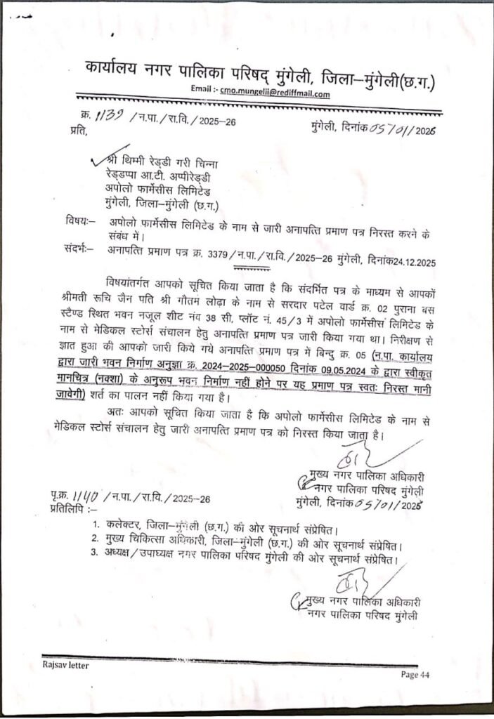 प्राप्त जानकारी के अनुसार, नगर पालिका परिषद मुंगेली द्वारा दिनांक 05 जनवरी 2026 को जारी पत्र में स्पष्ट किया गया है कि अपोलो फार्मेसी लिमिटेड के नाम से मेडिकल स्टोर संचालन हेतु जो अनापत्ति प्रमाण पत्र जारी किया गया था, वह शर्तों के उल्लंघन के कारण अब प्रभावहीन कर दिया गया है। यह पत्र नगर पालिका के मुख्य नगर पालिका अधिकारी द्वारा जारी किया गया है।