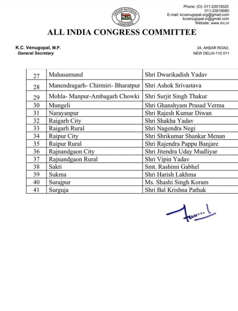 मुंगेली – अखिल भारतीय राष्ट्रीय कांग्रेस द्वारा कांग्रेस संगठन मे मजबूती लाने के उदेश्य से पुरे प्रदेश भर मे जिलाध्यक्ष के चयन की प्रकिया हुई थी,, जिसके लिए ए आई सी सी द्वारा चुने गए पर्यवेक्षकों द्वारा अपने क्षेत्र जाकर जिलाध्यक्ष पद के दावेदारों का आवेदन लेते हुए संगठन से कार्यकर्ताओ से रायशुमारी की गईं। जिसके उपरांत आज छतीसगढ़ के जिलाध्यक्ष की सूची जारी कर दी गईं,, जारी सूची मे घनश्याम वर्मा पर पार्टी ने एकबार फिर भरोसा जताते हुए उन्हें जिले का कमान सौपा है..
