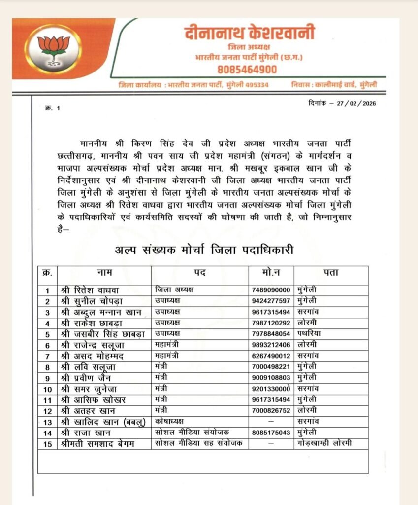भारतीय जनता अल्पसंख्यक मोर्चा जिला मुंगेली के जिला अध्यक्ष रितेश वाधवा द्वारा नई कार्यकारिणी की घोषणा करते हुए विभिन्न पदों पर जिम्मेदारियां सौंपी गईं। इसी क्रम में युवा कार्यकर्ता राजा खान को सोशल मीडिया संयोजक की महत्वपूर्ण जिम्मेदारी प्रदान की गई है। संगठन ने उन पर भरोसा जताते हुए डिजिटल माध्यमों के जरिए पार्टी की नीतियों और सरकार की योजनाओं को जन-जन तक पहुंचाने की अपेक्षा व्यक्त की है।