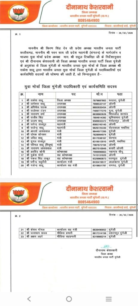 मुंगेली – भारतीय जनता पार्टी प्रदेश अध्यक्ष किरण सिंह देव पवन साय प्रदेश महामंत्री (संगठन) के मार्गदर्शन व भाजपा युवा मोर्चा प्रदेश अध्यक्ष राहुल टिकरिहा के निर्देशानुसार एवं दीनानाथ केशरवानी जिला अध्यक्ष भारतीय जनता पार्टी जिला मुंगेली के अनुशंसा से जिला मुंगेली के भारतीय जनता युवा मोर्चा के जिला अध्यक्ष राकेश साहू द्वारा भारतीय जनता युवा मोर्चा जिला मुंगेली के पदाधिकारियों एवं कार्यसमिति सदस्यों की घोषणा की गई । जिसमें जिला मीडिया सह प्रभारी युवा मोर्चा की जिम्मेदारी अक्षय लहरे को सौपी गई । जिससे उनके समर्थको में उत्साह का माहौल है। अपनी नियुक्ति को लेकर श्री लहरे ने कहा कि वरिष्ठो द्वारा जताये गये भरोसे पर खरा उतरने का प्रयास करेगे, और पार्टी के हित और नीतियों पर निष्ठा पूर्वक कार्य करेंगे ।