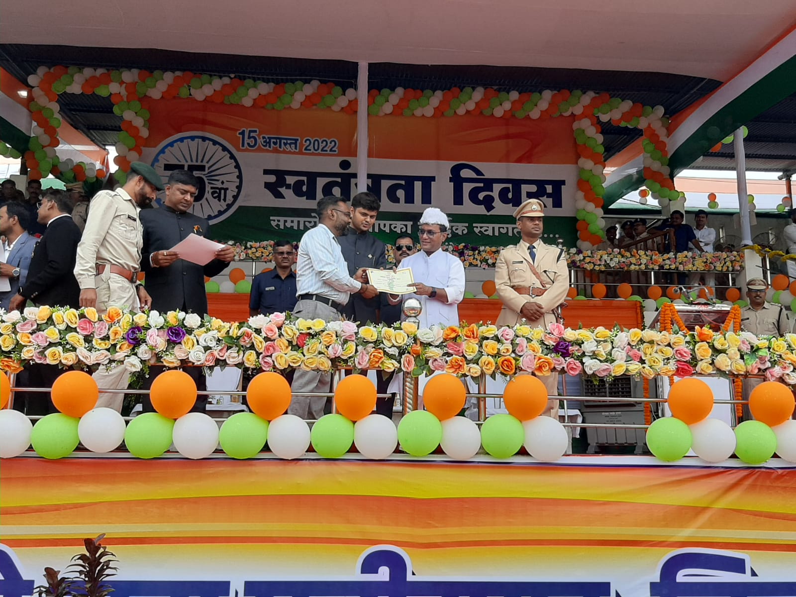प्रदेश के लोक स्वास्थ्य यांत्रिकी मंत्री तथा जिले के प्रभारी मंत्री श्री गुरू रूद्र कुमार ने संदेश वाचन के बाद मंच से कलेक्टर श्री देव और पुलिस अधीक्षक श्री सिंह के साथ शांति के प्रतीक कपोत और हर्षोल्लास के प्रतीक रंग-बिरंगे गुब्बारे आकाश में छोड़े। इस अवसर पर पुलिस बलों द्वारा हर्ष फायर किया गया। तत्पश्चात् प्रभारी मंत्री गुरू रूद्र कुमार ने वर्ष 2019-20 में शासन की महत्वाकांक्षी सुराजी गांव योजना के तहत सिंगारपुर पंचायत के आश्रित ग्राम पण्डोतरा में स्थापित गौठान में समिति द्वारा उत्कृष्ट आजीविकामूलक गतिविधियों के संचालन के लिए गौठान समिति के अध्यक्ष व सदस्यों को 25 हजार रूपए की राशि का चेक प्रदान कर सम्मानित किया गया। इसी तरह जिले में विभिन्न विभागों में उत्कृष्ट कार्य करने वाले अधिकारी- कर्मचारियों को प्रमाण पत्र और प्रशस्ति पत्र प्रदान कर सम्मानित किया।