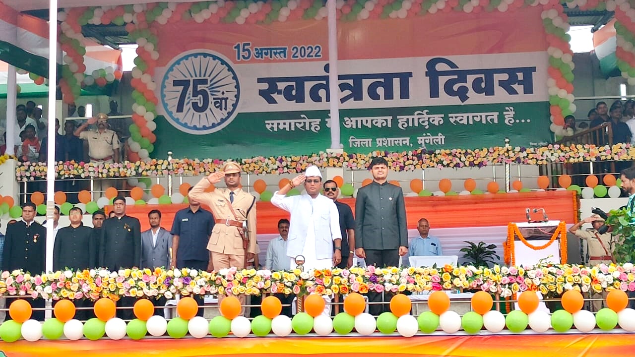 मुंगेली – आजादी के अमृत महोत्सव के अवसर पर राष्ट्रीय पर्व स्वतंत्रता दिवस 15 अगस्त के 75वीं वर्षगांठ मुंगेली जिले में गरिमा के अनुरूप हर्षोल्लास के साथ मनाया गया। प्रदेश के लोक स्वास्थ्य यांत्रिकी एवं ग्रामोद्योग मंत्री तथा जिले के प्रभारी मंत्री गुरू रूद्रकुमार ने मुख्य अतिथि की आसंदी से प्रातः 09 बजे जिला मुख्यालय मुंगेली स्थित डाॅ. श्यामा प्रसाद मुखर्जी स्टेडियम में आयोजित जिला स्तरीय मुख्य समारोह में राष्ट्रीय ध्वज फहराया। उन्होंने ध्वजारोहण पश्चात् परेड की सलामी ली एवं मार्च पास्ट का निरीक्षण किया।