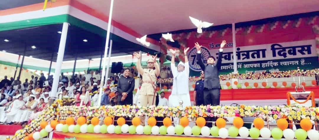 मुख्य अतिथि गुरू रूद्र कुमार ने मुख्यमंत्री श्री बघेल द्वारा प्रेषित स्वतंत्रता दिवस संदेश का वाचन करते हुए कहा कि आजाद भारत के अमृत महोत्सव के मायने और मूल्यों को समझने के लिए हमें दो शताब्दियों की गुलामी को याद करना होगा। हमारे पुरखों ने अपनी जान दांव पर लगाकर, फिरंगी सरकार के खिलाफ बगावत का झंडा बुलंद किया था। उनका त्याग और बलिदान देश की भावी पीढ़ियों का जीवन खुशहाल बनाने के लिए था। हमारा कर्तव्य है कि उनके सपनों को साकार करें और उनकी स्मृतियों को चिरस्थायी बनाएं। उन्होंने मुख्यमंत्री का संदेश वाचन करते हुए कहा कि हम आजादी की 75वीं सालगिरह के अवसर पर देश और दुनिया के सामने, बापू के सिद्धांतों और विचारों के अनुरूप कार्य करने में सफल हुए हैं। इसमें प्रकृति-सम्मत विकास, हर व्यक्ति को गरिमा, न्याय व बराबरी के अवसर देने वाली योजनाएं एवं कार्यक्रम शामिल हैं। उन्होंने मुख्यमंत्री का संदेश वाचन करते हुए कहा कि ‘राजीव गांधी किसान न्याय योजना’ अब तीसरे वर्ष में प्रवेश कर चुकी है और इससे लगभग 13 हजार करोड़ रूपए की राशि किसानों को दी जा चुकी है। इस तरह एक सीजन में किसानों को प्रति एकड़ 09 हजार रूपए की आदान सहायता देने वाला पहला राज्य हमारा छत्तीसगढ़ है। ‘गोधन न्याय योजना’ भी तीसरे वर्ष में प्रवेश कर चुकी है, इसके अंतर्गत अब तक गोबर विक्रेताओं, गौठान समितियों तथा स्व सहायता समूहों को 312 करोड़ रूपए दिए जा चुके हैं। इसी तरह राजीव गांधी ग्रामीण भूमिहीन कृषि मजदूर न्याय योजना अपने दूसरे वर्ष में प्रवेश कर चुकी है और इसके तहत अब तक पात्र हितग्राहियों को 213 करोड़ रूपए की राशि दी जा चुकी है। फसल विविधीकरण की गति बढ़ाने के लिए ‘टी-काफी बोर्ड’ का गठन किया गया है। दलहन-तिलहन का उत्पादन बढ़ाने के लिए हमने बहुत से कदम उठाएं है। इस वर्ष से दलहन फसलों की खरीदी भी समर्थन मूल्य पर की जाएगी। प्रदेश में लघु धान्य फसलों को प्रोत्साहित करने के लिए ‘छत्तीसगढ़ मिलेट मिशन’ का गठन किया गया है। कोदो, कुटकी, रागी का न्यूनतम समर्थन मूल्य घोषित कर इनकी खरीदी करने वाला देश का पहला राज्य छत्तीसगढ़ है। गोबर से बिजली बनाने के लिए ‘भाभा एटाॅमिक रिसर्च सेंटर’ के साथ प्रौद्योगिकी साझा करने हेतु एमओयू किया गया है।